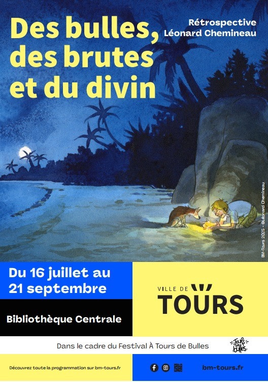 - Des bulles, des brutes et du divin – Rétrospective Léonard Chemineau à la bibliothèque municipale de Tours du 15 juillet au 20 septembre 2025.