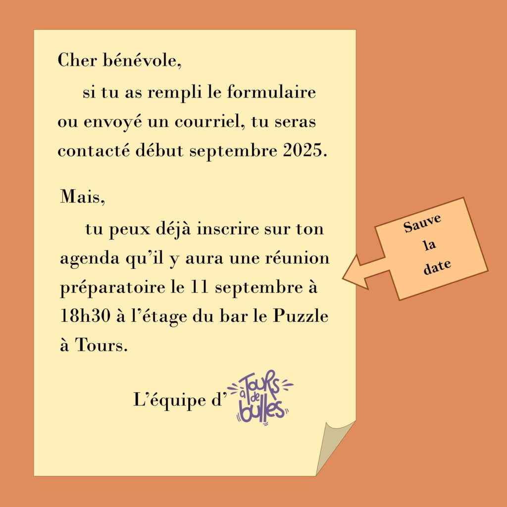 Remplissez la fiche bénévole iciou écrivez à benevoles@atoursdebulles.frVous souhaitez participer à l’organisation du festival ou assister au club de lecture ?Contactez-nous dès à présent